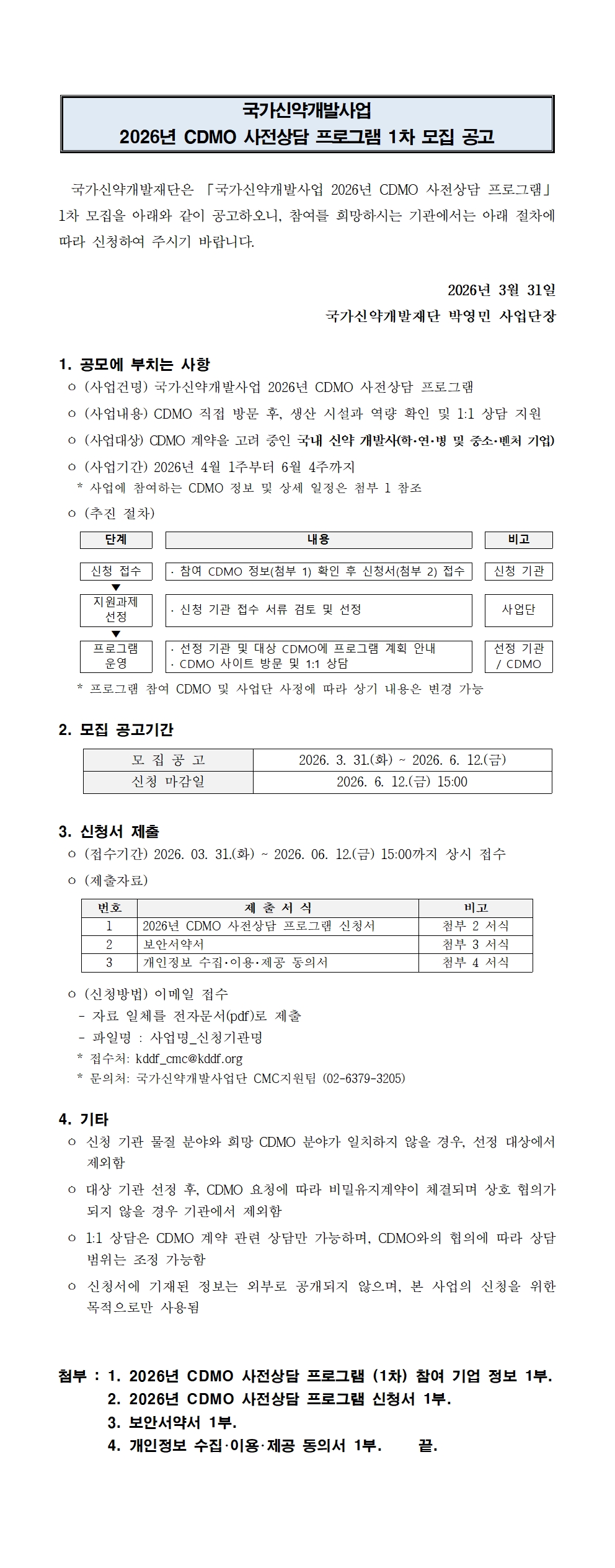 [홍보협조] 국가신약개발사업 2026년 CDMO 사전상담 프로그램 1차 모집 공고